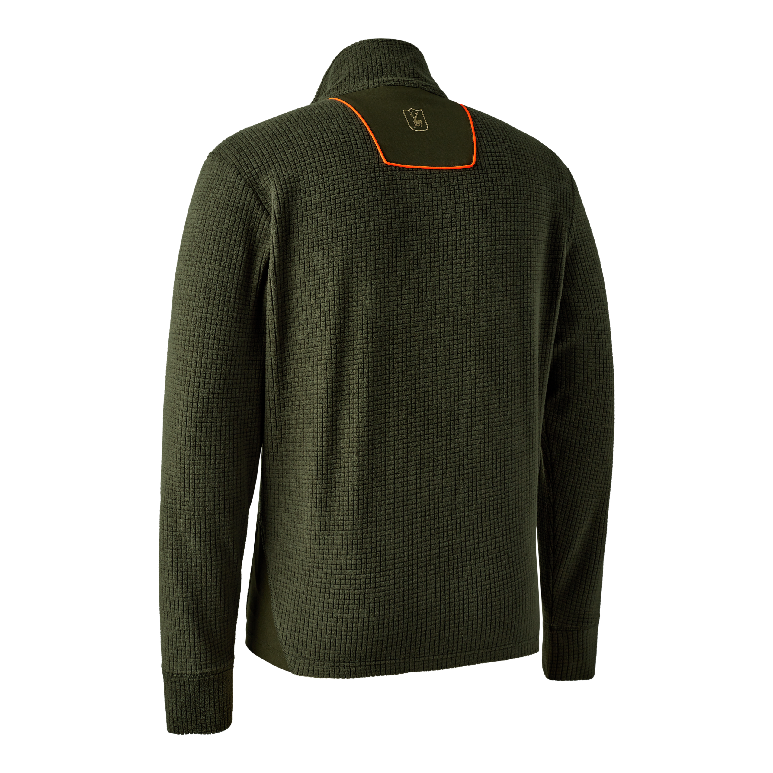 Die Chamois Full-Zip Fleecejacke ist eine leichte, flexible Mittelschicht für Bewegung und ganztägigen Komfort. Gefertigt aus dehnbarem Gitterfleece mit Kontrastmaterial, bietet sie Wärme und Atmungsaktivität. Der kräftige orangefarbene Reißverschluss und passende Details an Brust und Rücken verleihen einen modernen Touch. Eine verdeckte Brusttasche sichert kleine Gegenstände, während Daumenlöcher zusätzlichen Schutz bieten und die Ärmel unter weiteren Schichten an Ort und Stelle halten. Ob Solo an milden Tagen oder unter der Chamois-Jacke in der Kälte – dieses Fleece passt perfekt in deine Jagdgarderobe.